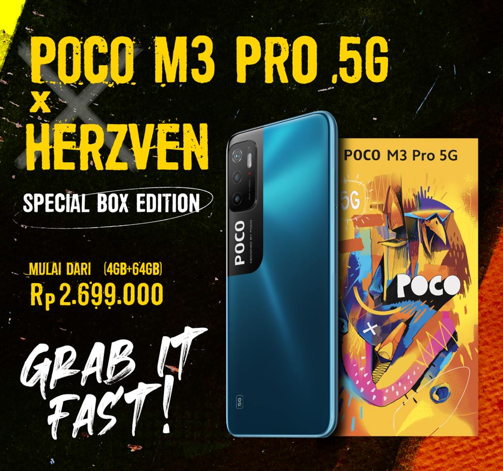 Menjelang musim libur akhir tahun, POCO Indonesia adakan kolaborasi dengan Herzven, untuk berikan tampilan creative visual yang unik sekaligus memiliki basis pendukung komunitas yang kuat. Lewat kolaborasi ini, konsumen bisa membeli POCO M3 Pro 5G Special Box Herzven yang sudah bisa didapat sejak awal Desember 2021.