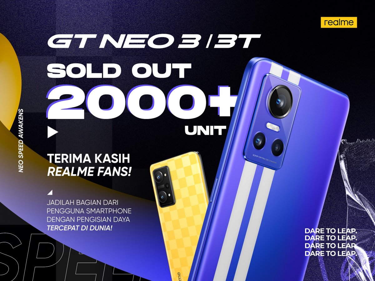 Jakarta, Gizmologi – Membawa perkembangan teknologi pengisian daya smartphone tercepat di dunia saat ini, realme Indonesia telah membuka pre-order seri terbarunya yakni realme GT NEO 3, hadir dalam dua varian yakni 80W dan 150W. Ditambah dengan seri GT NEO 3T, penjualannya cukup membanggakan.