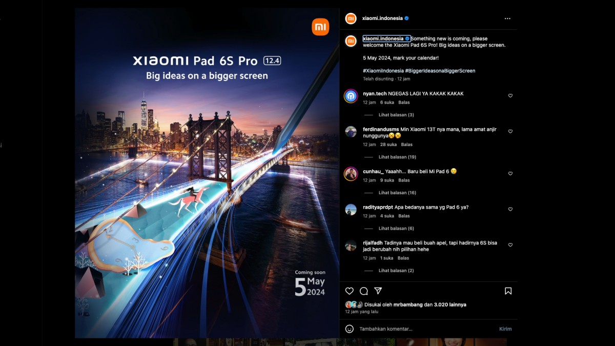 Informasi terkait tanda-tanda kehadiran tablet Xiaomi Pad 6S Pro sendiri diunggah langsung melalui akun media sosial resmi Xiaomi Indonesia. Dalam sebuah unggahan gambar, ditunjukkan kebolehan tablet Xiaomi terbaru satu ini untuk bisa menuangkan produktivitas penggunanya dalam sebuah layar berukuran lebih besar.