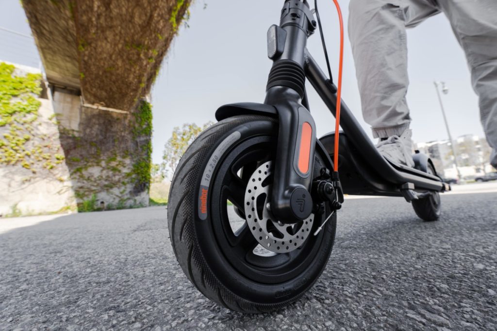 Skuter ini juga menerapkan dua sistem pengereman, rem cakram di roda depan dan E-ABS di roda belakang. Terdapat sertifikasi IPX5 juga pada bada skuter dan IPX6 pada kemasan baterai menjamin pengguna bisa mengoperasikan skuter listrik ini di segala cuaca tanpa khawatir.