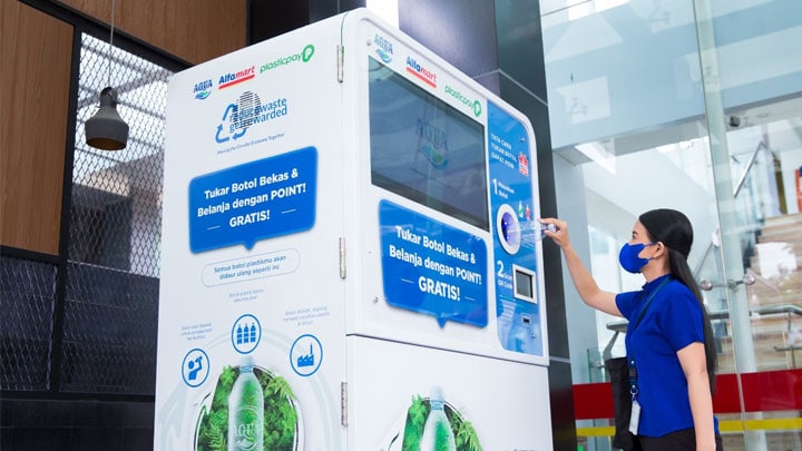 Lewat kerja sama Danone-AQUA dengan Alfamart dan PlasticPay menghadirkan Reverse Vending Machine (RVM) atau Mesin Penukaran Botol plastik pasca-konsumsi guna mempermudah pengelolaan sampah botol plastik. Menariknya lewat mesin ini, botol plastik yang ditukarkan bisa menjadi poin Gopay hingga ShopeePay.