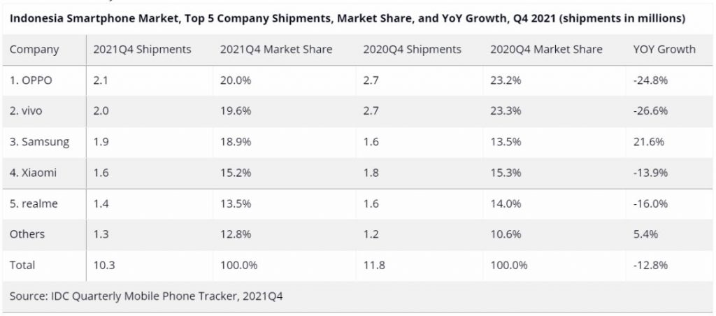 Diketahui ada 5 vendor smartphone teratas di Indonesia berdasarkan hasil riset IDC kuartal IV-2021 yaitu Oppo, Vivo, Samsung, Xiaomi dan Realme. Di mana Oppo menjadi pemain nomor satu di Indonesia dan menguasai pangsa pasar low-end pada tahun lalu.