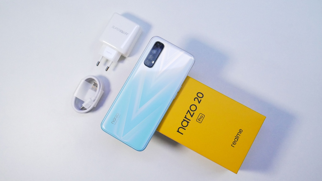 Dengan desain boks yang khas seperti produk realme lainnya, realme narzo 20 Pro hadir dengan beberapa kelengkapan seperti buku panduan, kartu garansi, sim ejector serta case silikon. Berguna untuk melindungi bodi smartphone, agar konsumen tak perlu membeli aksesori tambahan. Selain itu, juga ada kabel USB-A ke USB-C, serta sebuah adapter charger yang spesial.