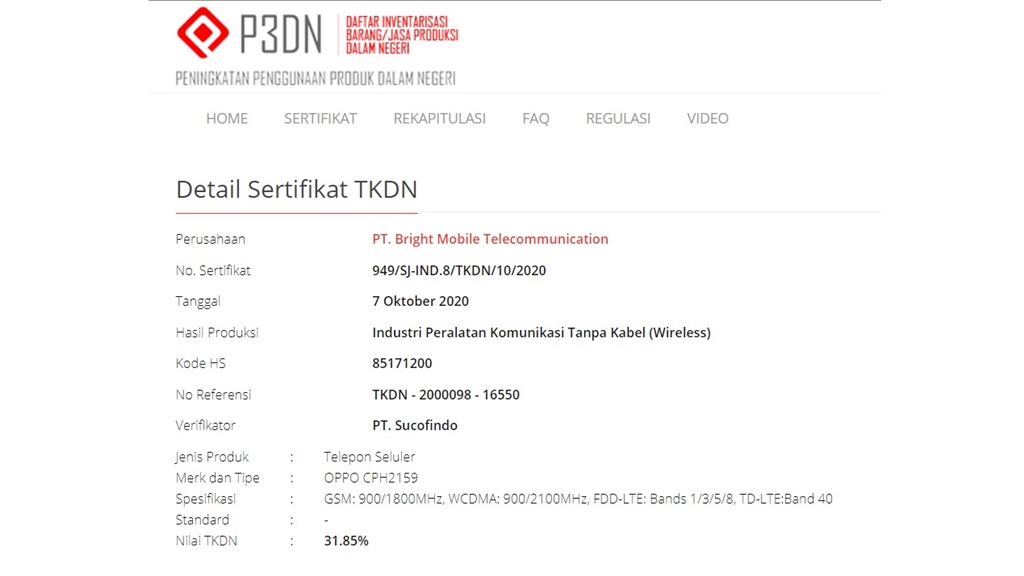 Pada situs resmi sertifikasi postel, telah ada sebuah sertifikat perangkat dengan kode CPH 2159. Perangkat tersebut terdaftar dengan nomor 71283/SDPPI/2020. Memiliki kode yang sama, tercatat pula di situs TDKN, telah memenuhi nilai TKDN sebesar 31,85%, alias sudah sesuai dengan nilai paling rendah untuk sebuah smartphone agar dapat gunakan konektivitas 4G.