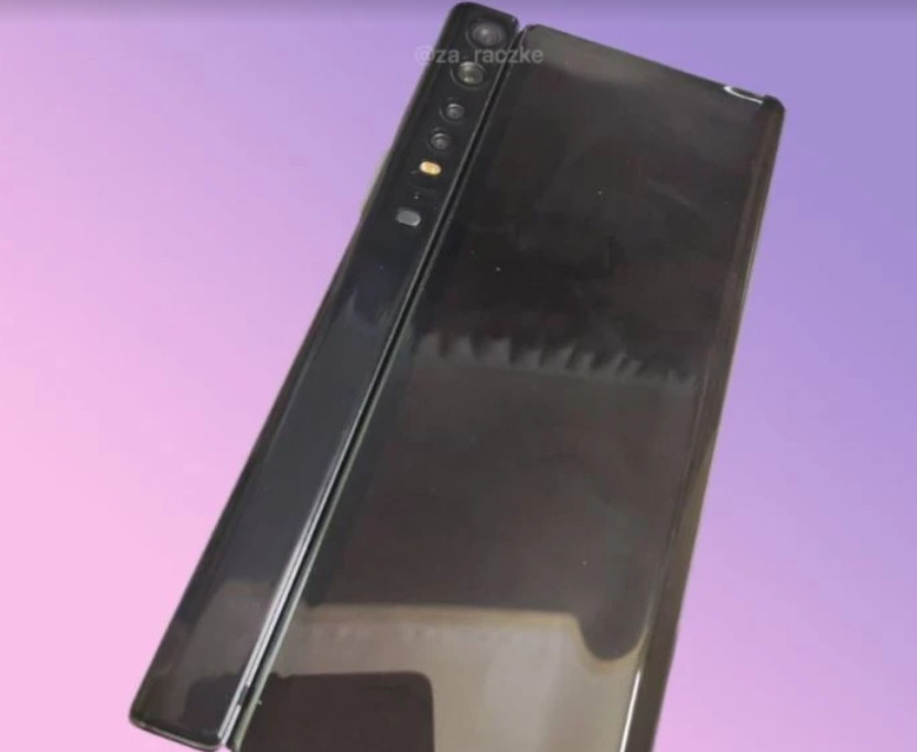Jika diperhatikan secara seksama, kita bisa melihat ada empat kamera, lampu LED flash, dan di bagian tombolnya ada sebuah tombol. Kemungkinan tombol ini adalah pengunci ponsel, ketika ditekan maka akan terbuka lipatannya.