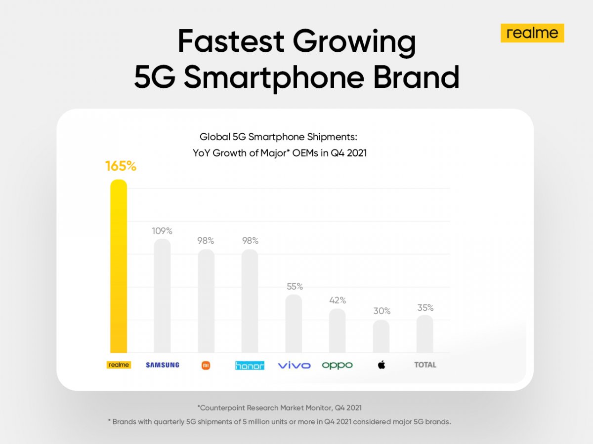 Seperti yang terlihat pada gambar di atas, realme berhasil mendapatkan pertumbuhan nilai pengiriman smartphone 5G tertinggi dibandingkan enam merek global lainnya. Pada kuartal keempat tahun 2021, pertumbuhannya mencapai 165% year-on-year, dibandingkan data dari tahun sebelumnya. Menyalip Samsung dengan 109%, OPPO di 42% bahkan Apple di 30% saja.