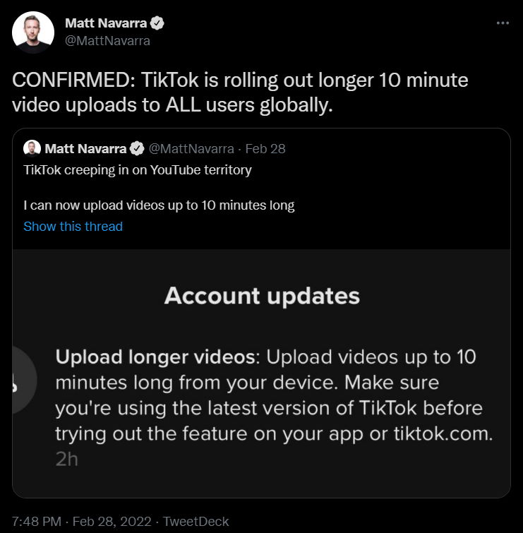 โTahun lalu, kami memperkenalkan video yang lebih panjang, memberi komunitas kami lebih banyak waktu untuk membuat dan terhibur di TikTok. Hari ini, kami bersemangat untuk mulai meluncurkan kemampuan untuk mengupload video berdurasi hingga 10 menit, yang kami harap akan membuka lebih banyak kemungkinan kreatif bagi kreator kami di seluruh dunia.โ
